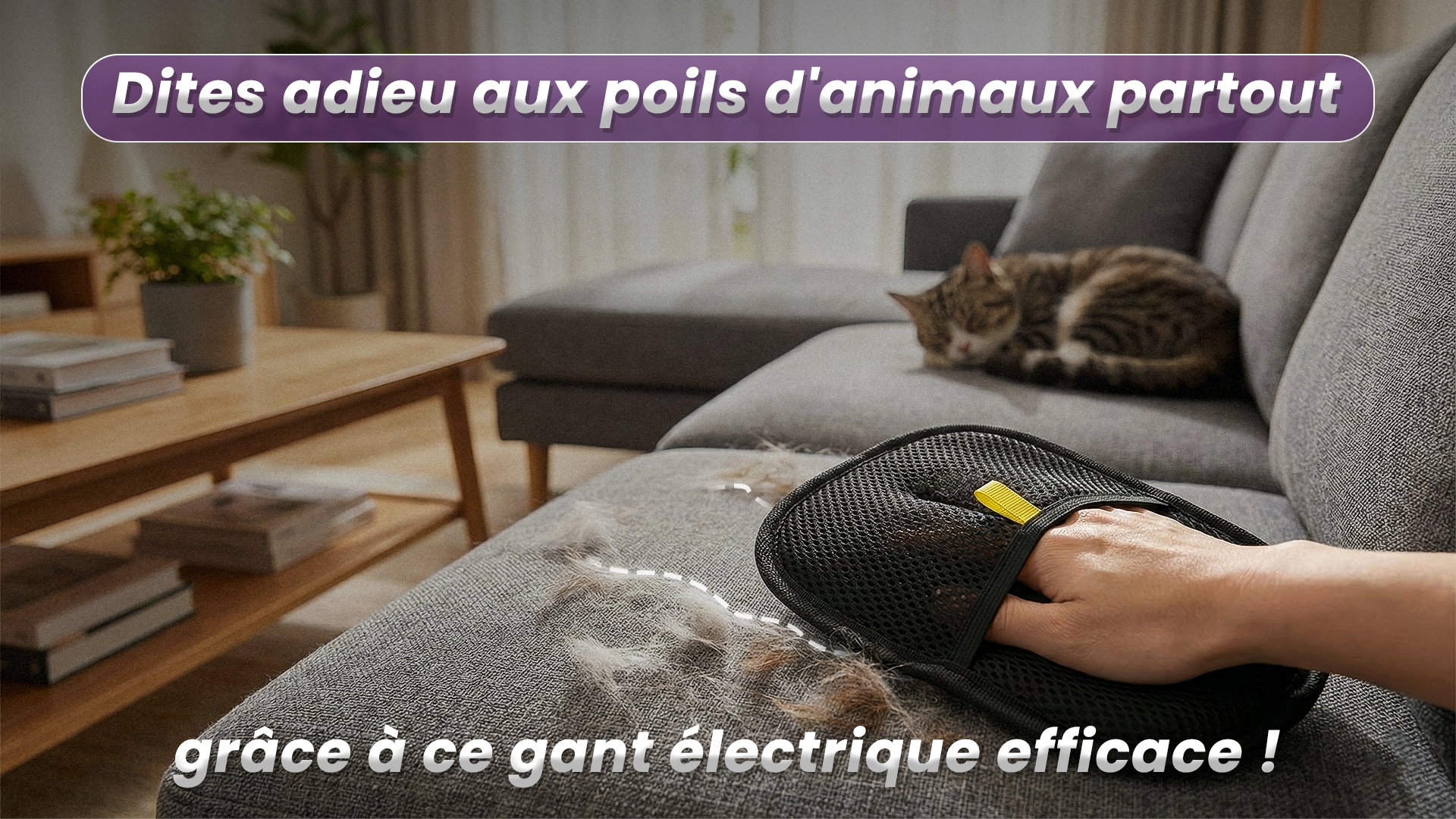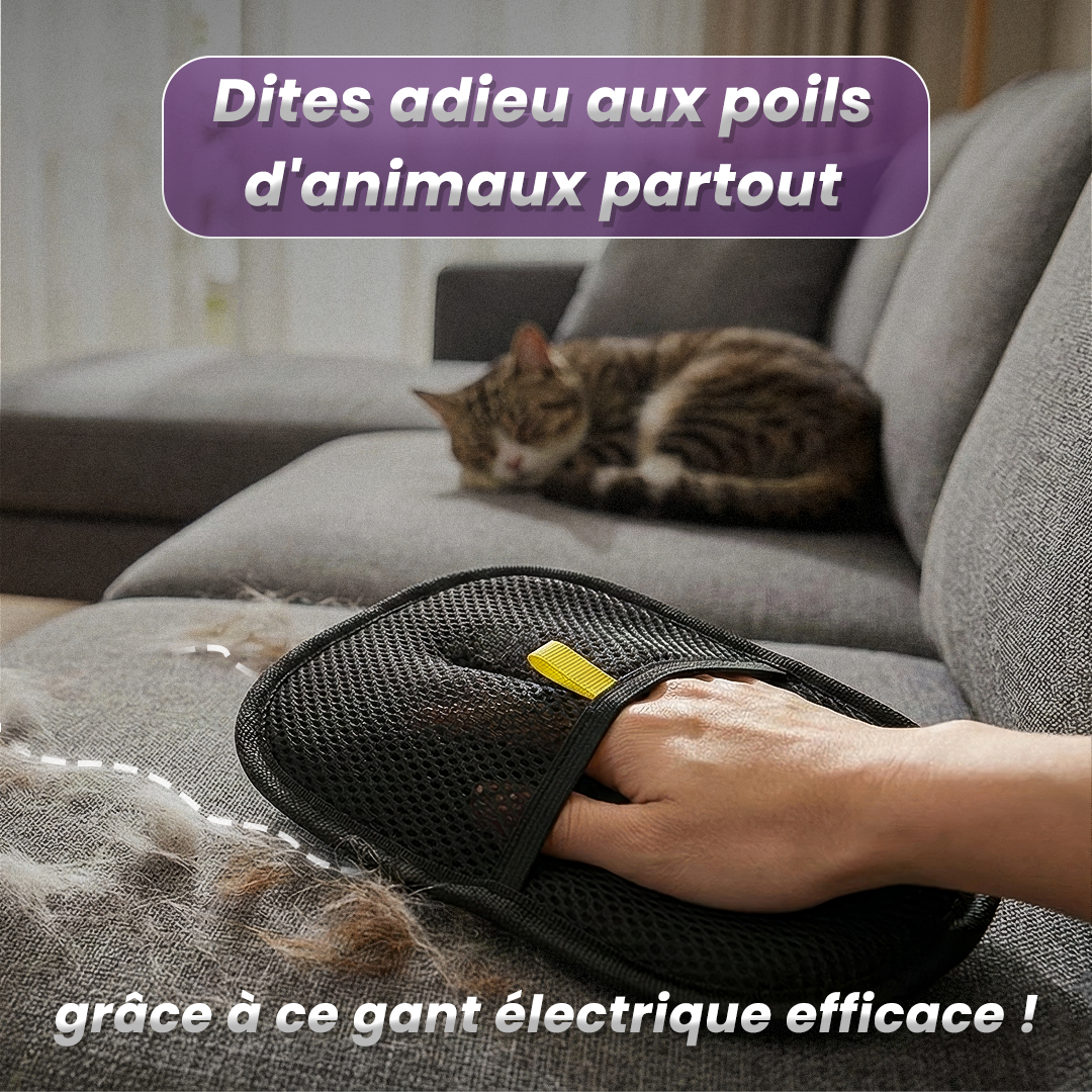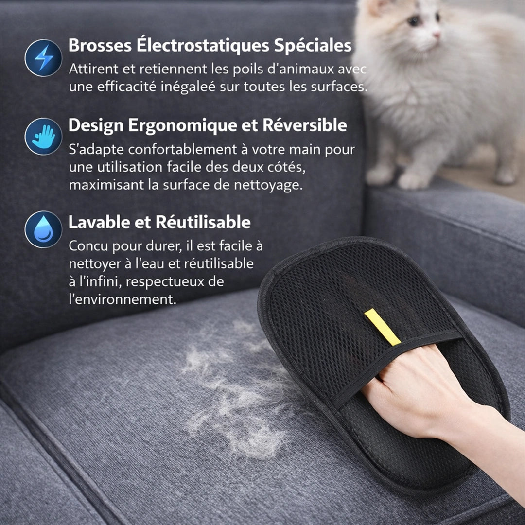 Notre gant utilise des poils spéciaux qui génèrent une charge électrostatique lors du contact, attirant et adhérant aux poils d'animaux présents sur les surfaces ou directement sur votre compagnon. Il suffit de ramasser les poils accumulés d'une main.